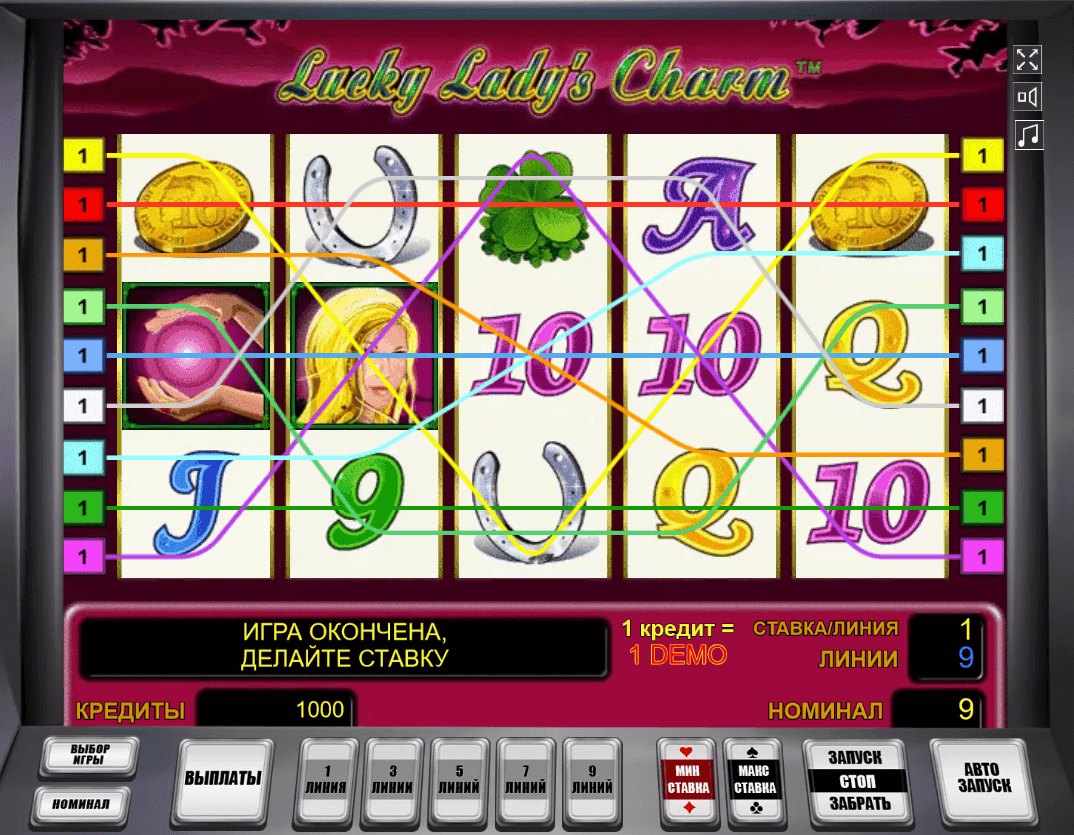 Встреча с прекрасной дамой состоится на игровом поле гаминатора Lucky Lady’s Charm, состоящем из пяти барабанов и девяти призовых линий. Кнопками «1 Line…9 Line» азартные игроки смогут задействовать соответствующее количество линий.